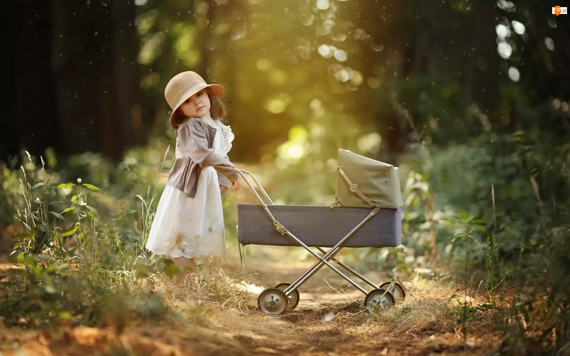 Sukienka, Kapelusz, Biała, Dziewczynka, Wózek