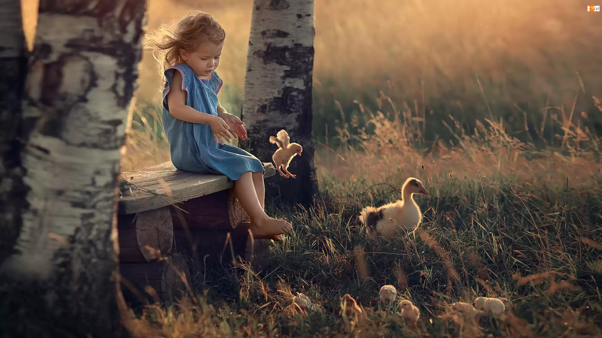 Sukienka, Ławeczka, Niebieska, Dziewczynka, Gąski