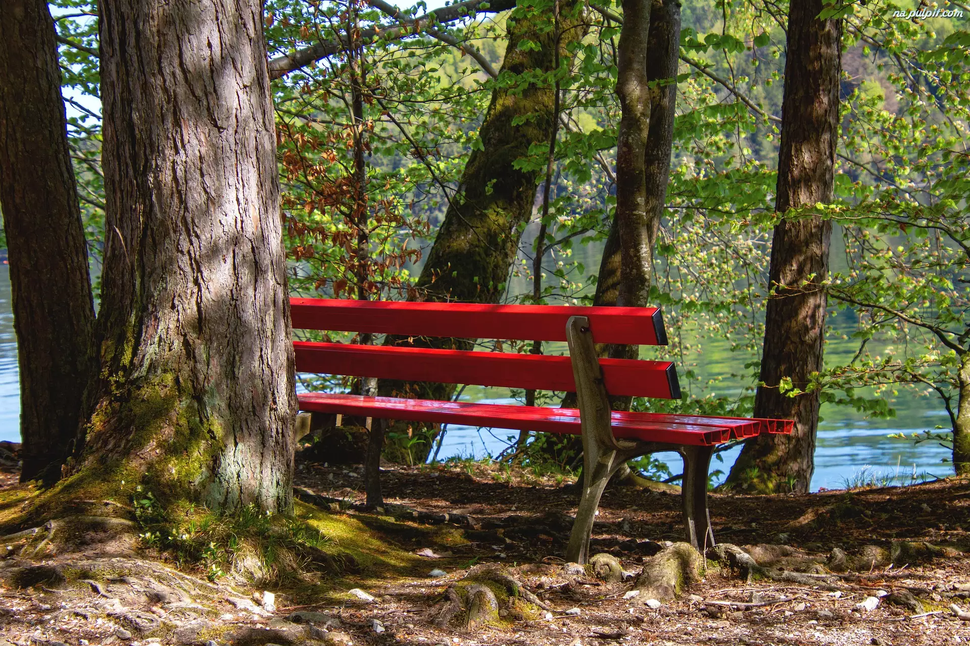 Ławka, Czerwona, Liście, Woda, Drzewa, Korzenie
