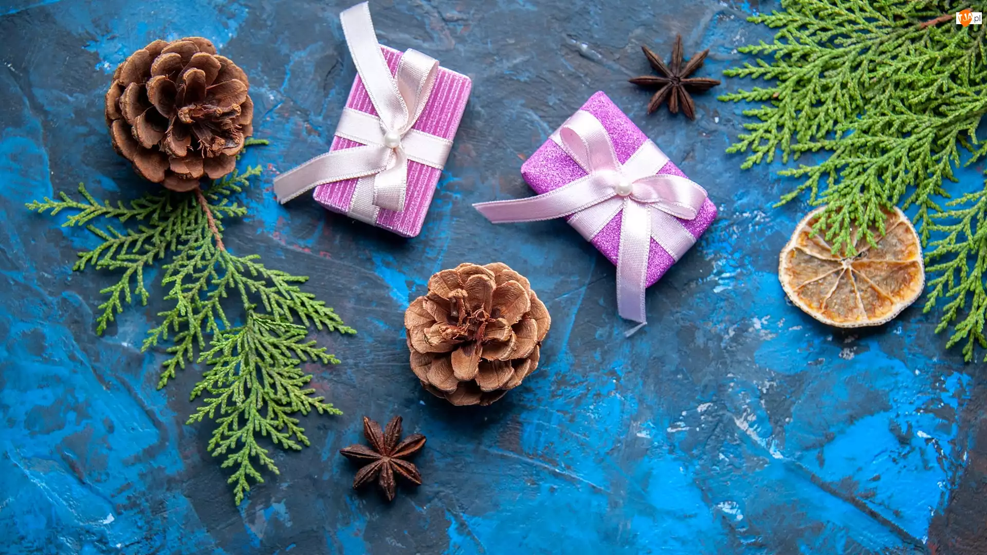 Prezenty, Tło, Gałązki, Szyszki, Niebieskie