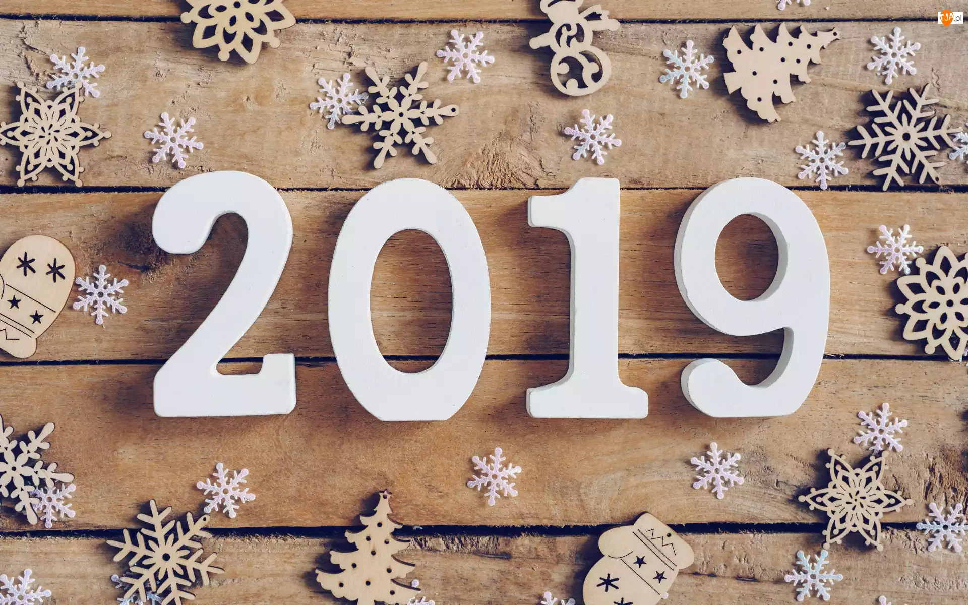 2019, Nowy Rok, Śnieżynki, Deski, Ozdoby, Choinki