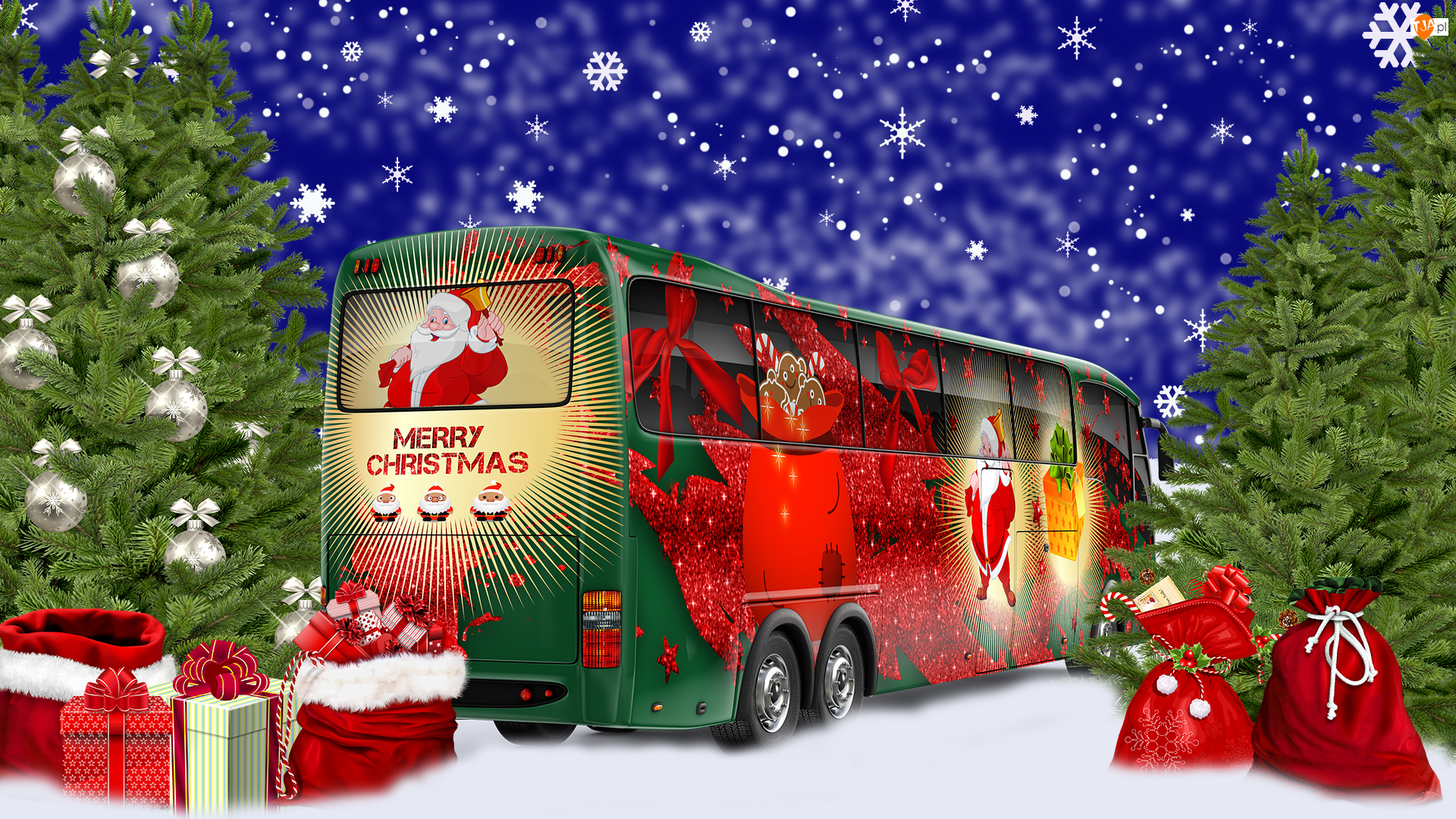 Autobus, Świąteczny, Choinka, Grafika, Drzewa, Prezenty
