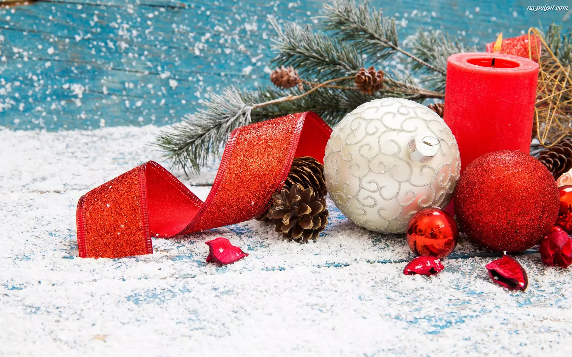 Stroik, Boże Narodzenie, Świeczka, Kompozycja, Wstążka, Bombki, Gałązki