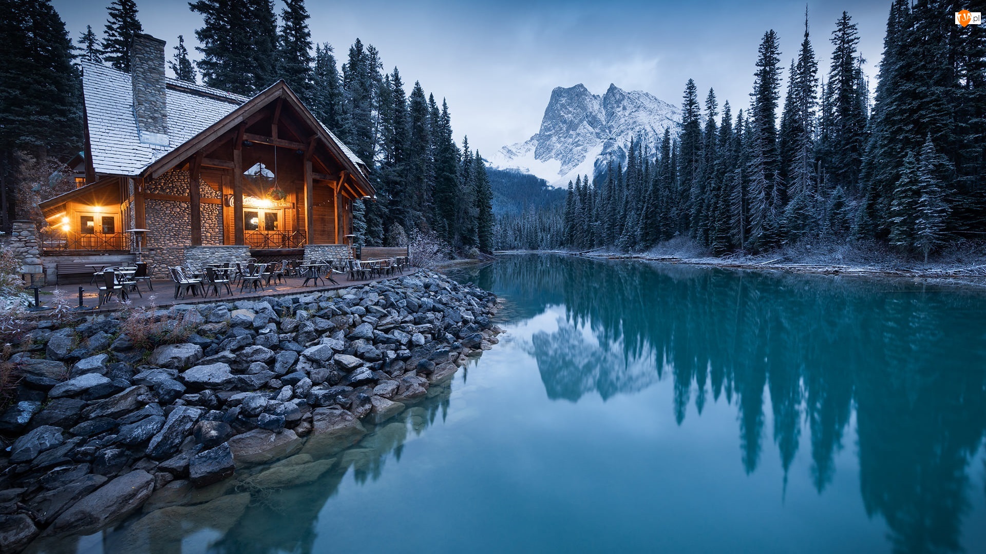 Światła, Jezioro, Park Narodowy Yoho, Emerald Lake, Cilantro on the Lake, Kolumbia Brytyjska, Drzewa, Restauracja, Góry, Dom, Kanada