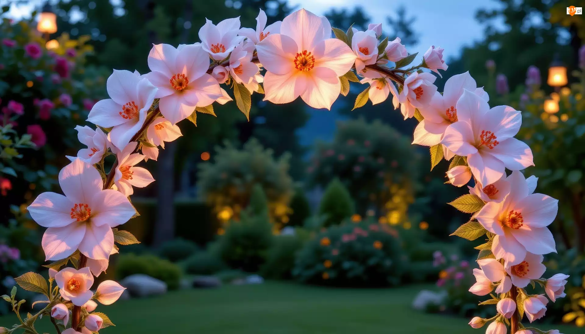 Światło, Grafika AI, Łuk, Kwiaty, Ogród