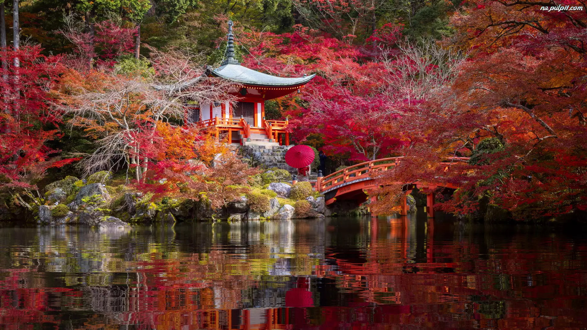 Drzewa, Benten-do, Staw, Japonia, Jesień, Świątynia, Daigo-ji, Most, Kompleks, Ogród, Park, Kioto