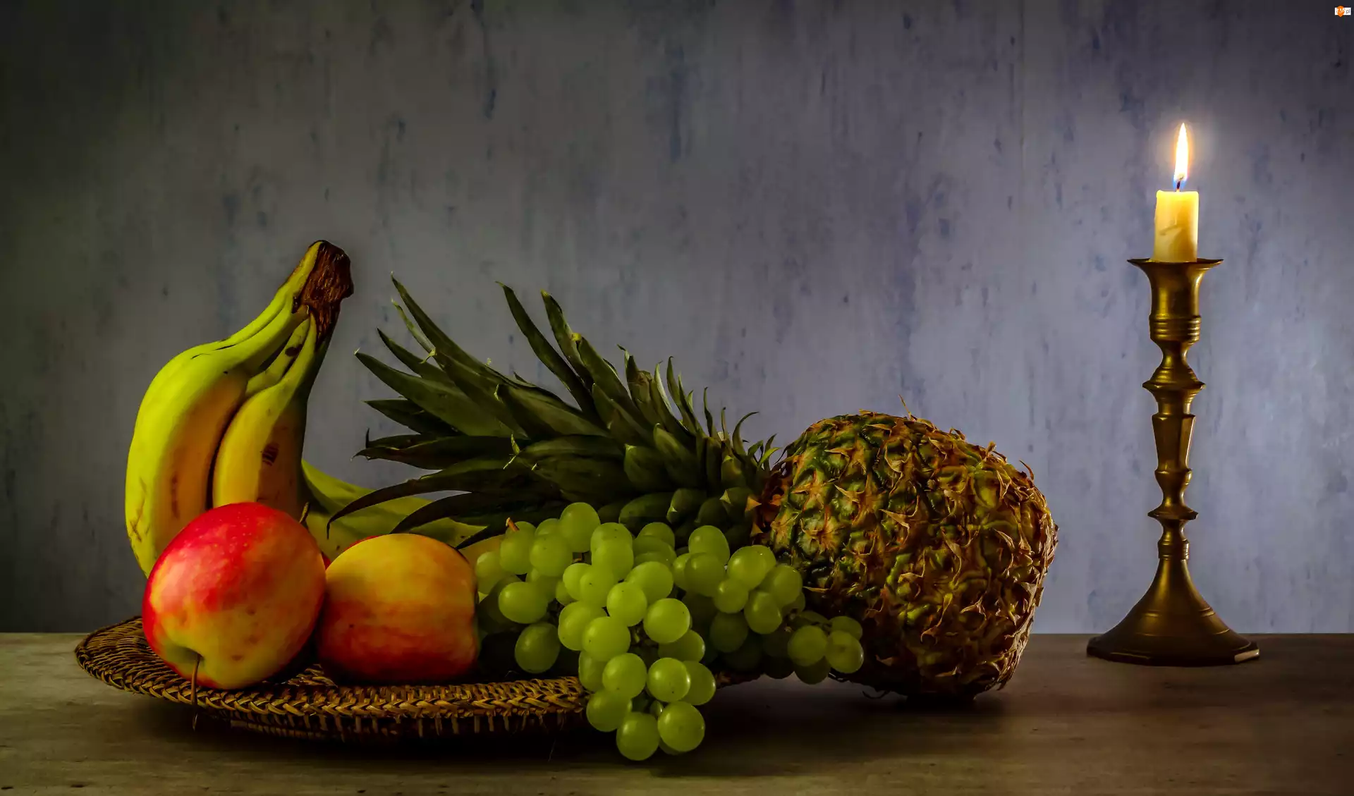 Świeca, Ananas, Jabłka, Winogrona, Banany