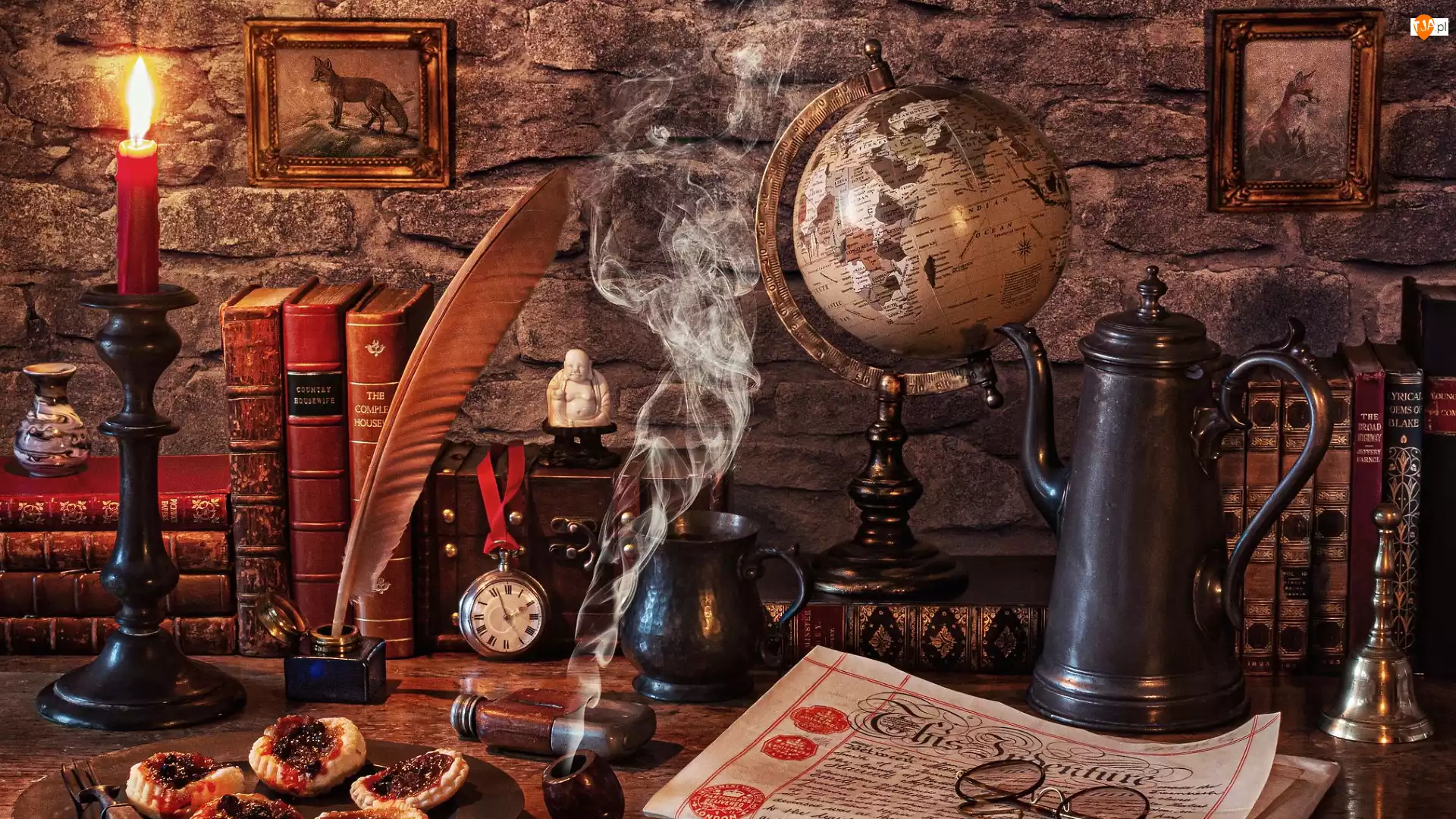 Świeca, Globus, Książki, Kompozycja, Dzbanek