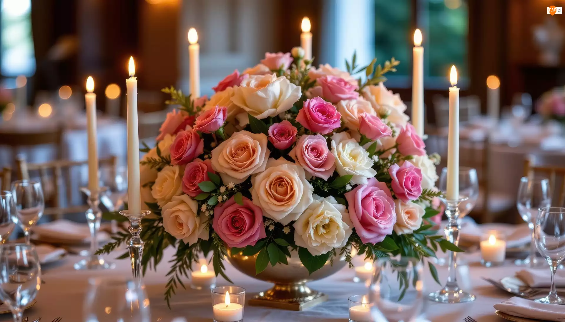 Świece, Grafika AI, Bukiet, Róże, Stół