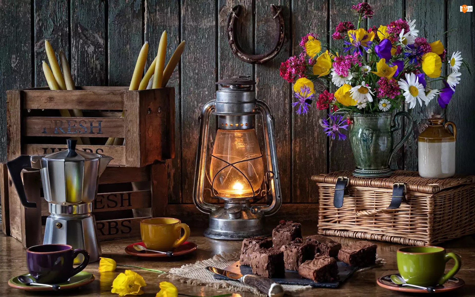 Świece, Kompozycja, Podkowa, Kawiarka, Bukiet kwiatów, Skrzynki, Ciasto, Lampa