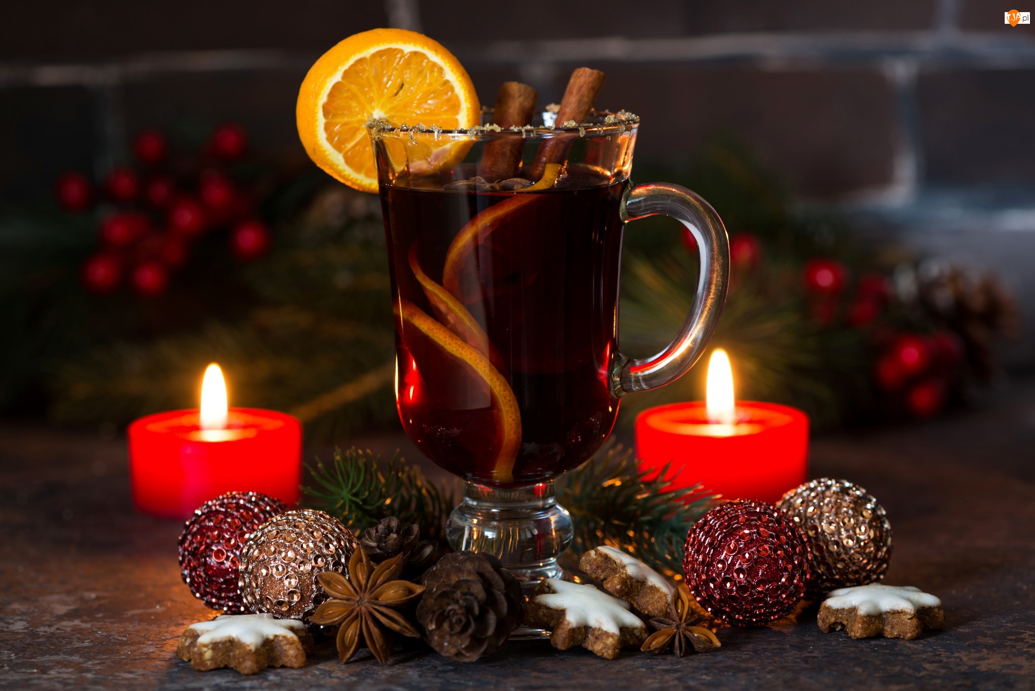Cytryny, Grzane wino, Świąteczna, Laski, Pierniczki, Ciasteczka, Anyżek, Szklanka, Plasterki, Kompozycja, Bombki, Świeczki, Cynamonu