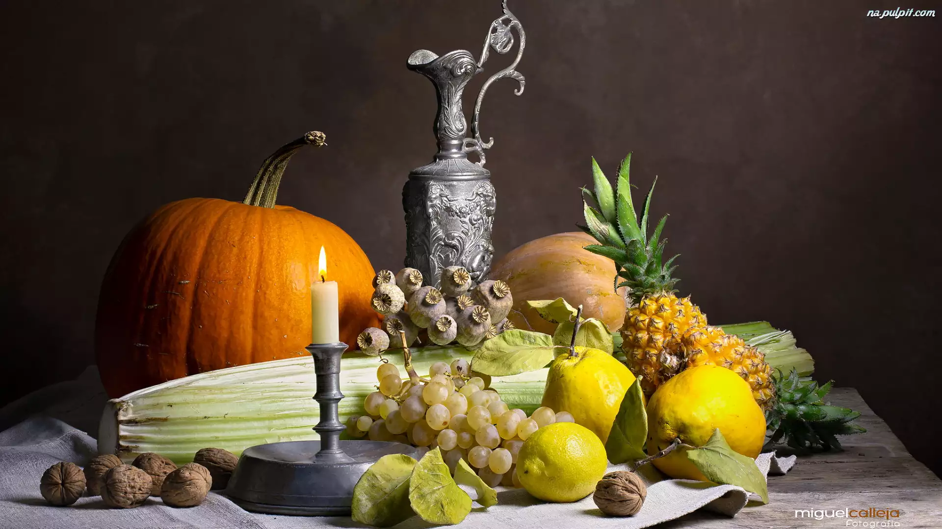 Kompozycja, Warzywa, Świeczka, Orzechy, Dzban, Dynia, Winogrona, Owoce, Ananasy
