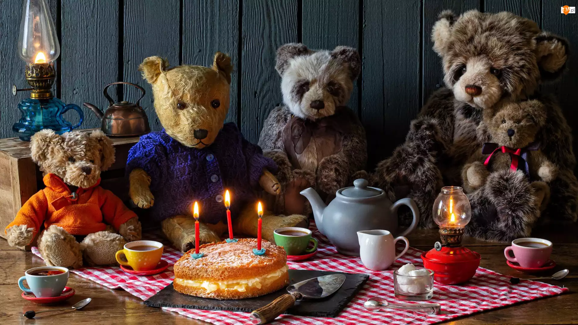 Świeczki, Kompozycja, Lampa, Filiżanki, Miski, Tort, Czajnik, Pluszaki