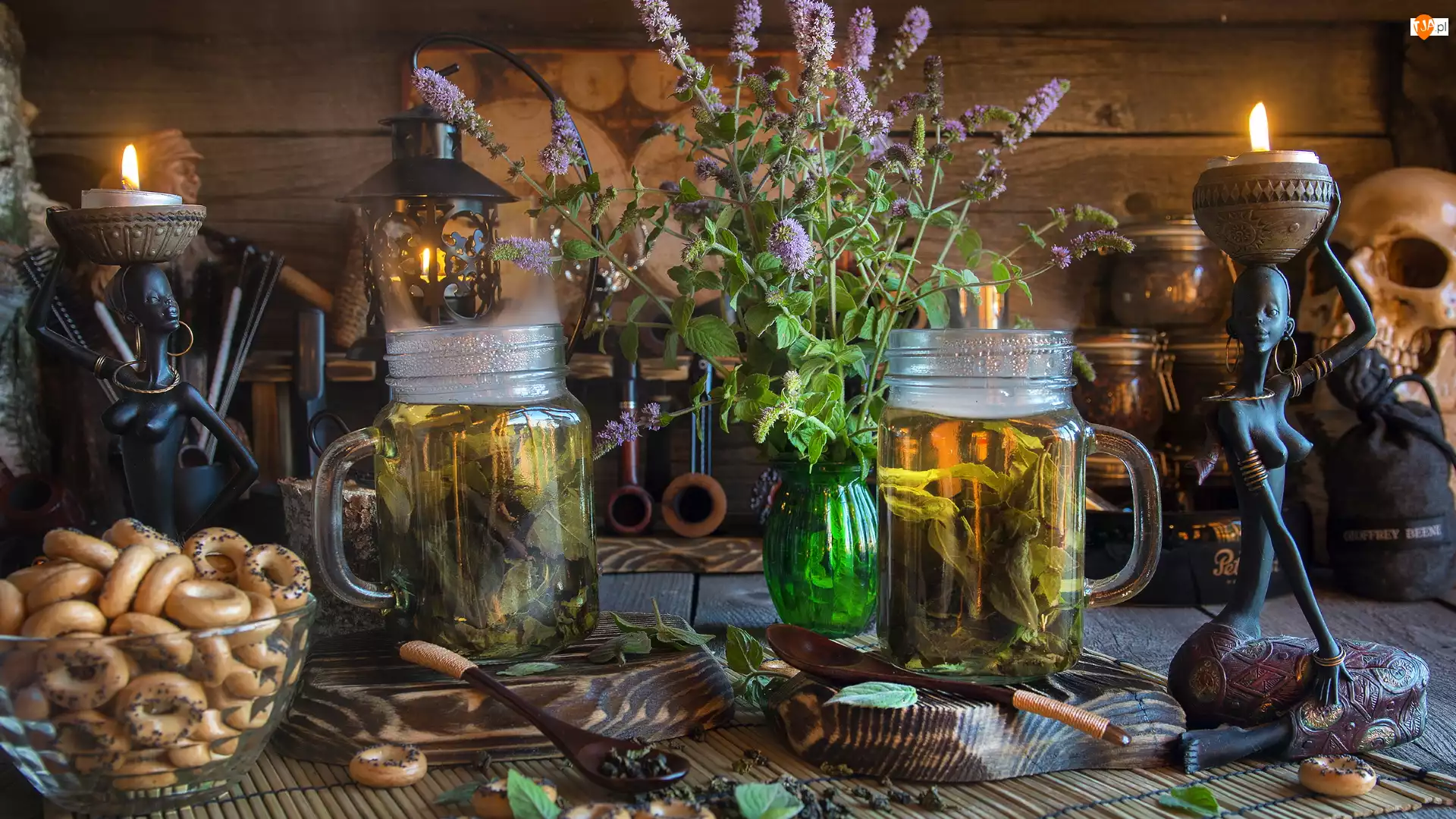 Świeczki, Mięty, Precelki, Kwiaty, Dwa, Kompozycja, Napar, Słoiki, Mięta pieprzowa, Figurki
