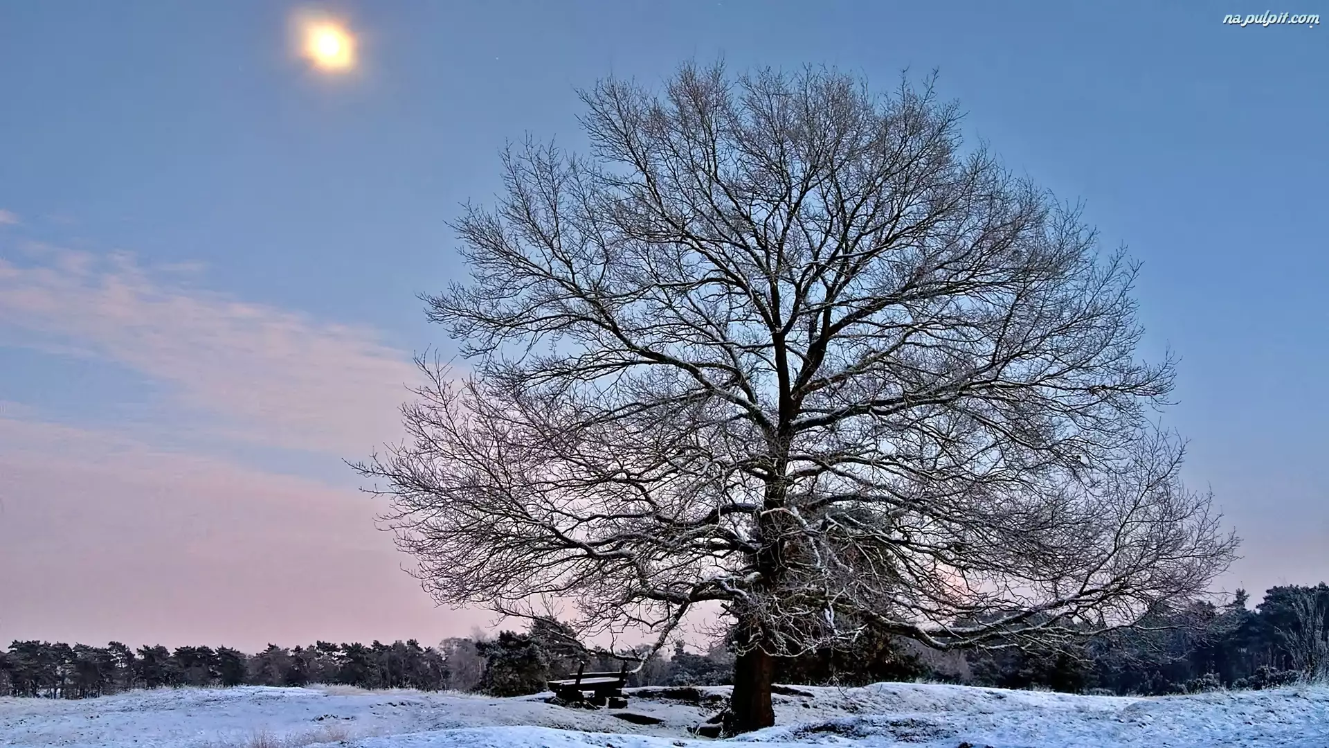 Świt, Ośnieżone, Samotne, Pole, Drzewo