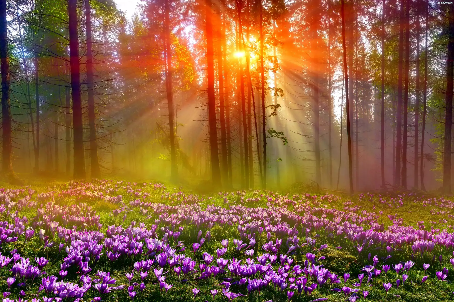 Świt, Promienie, Drzewa, Las, Jesienne krokusy, M