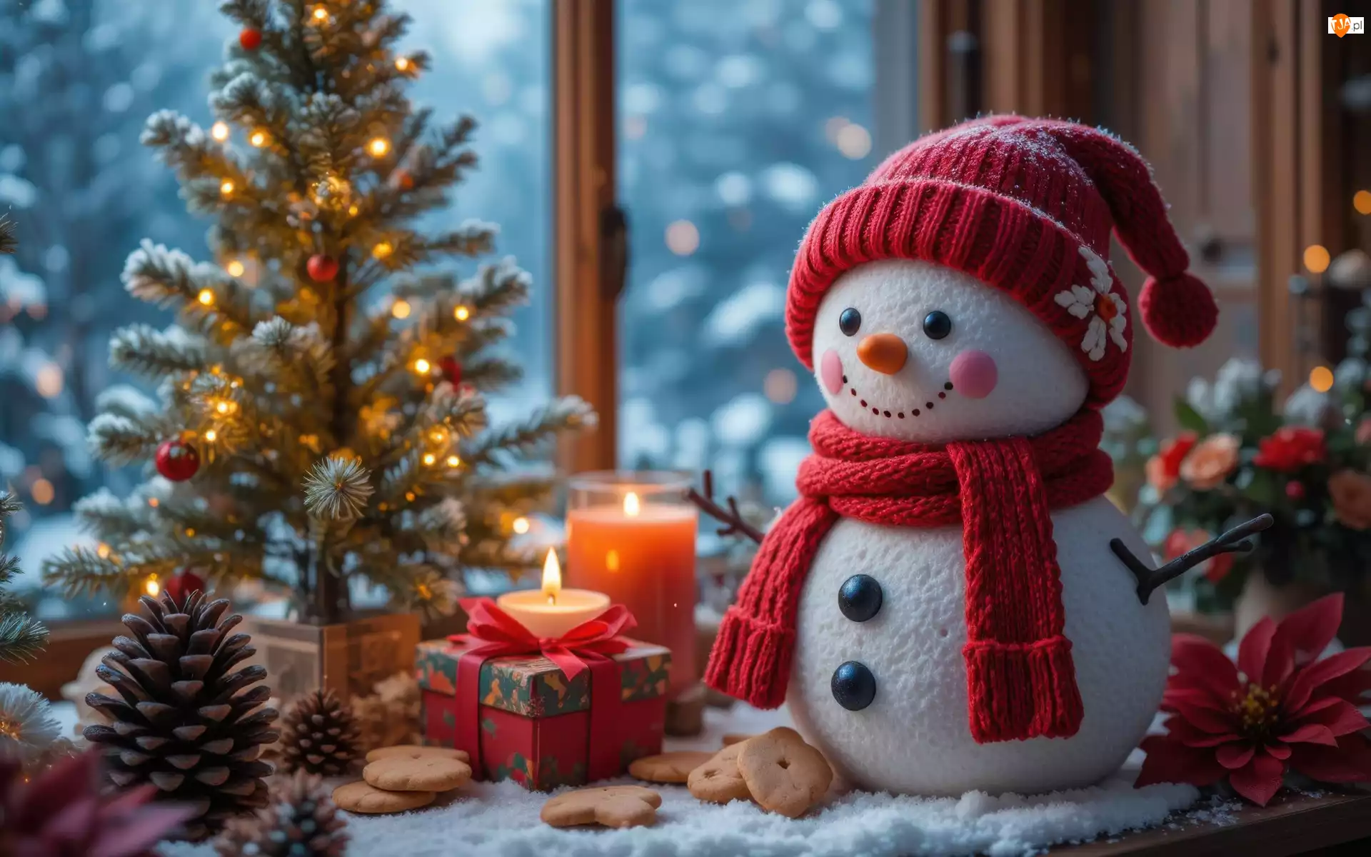 Szalik, Choinka, Świece, Ciasteczka, Bałwanek, Szyszki, Udekorowana, Boże Narodzenie, Prezent, Czapka, Śnieg