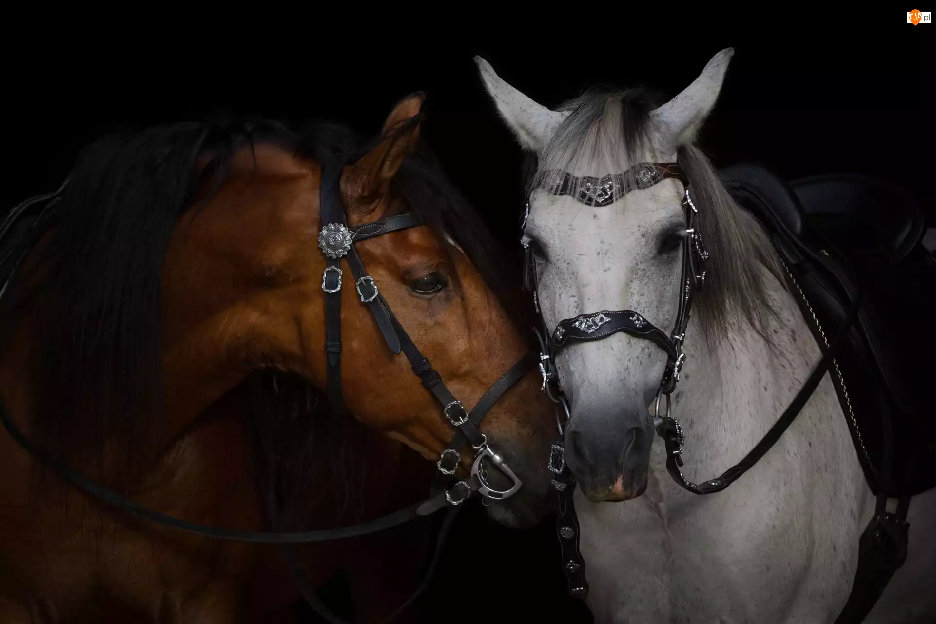 Konie, Dwa, Gniady, Uprząż, Jasnoszary, Para