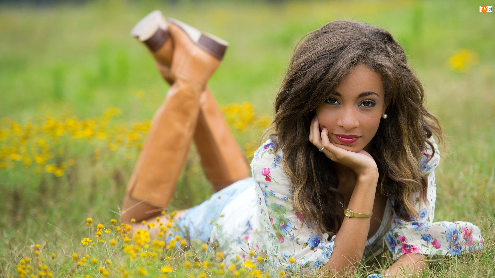 Szatynka, Łąka, Kobieta, Leżąca, Sukienka