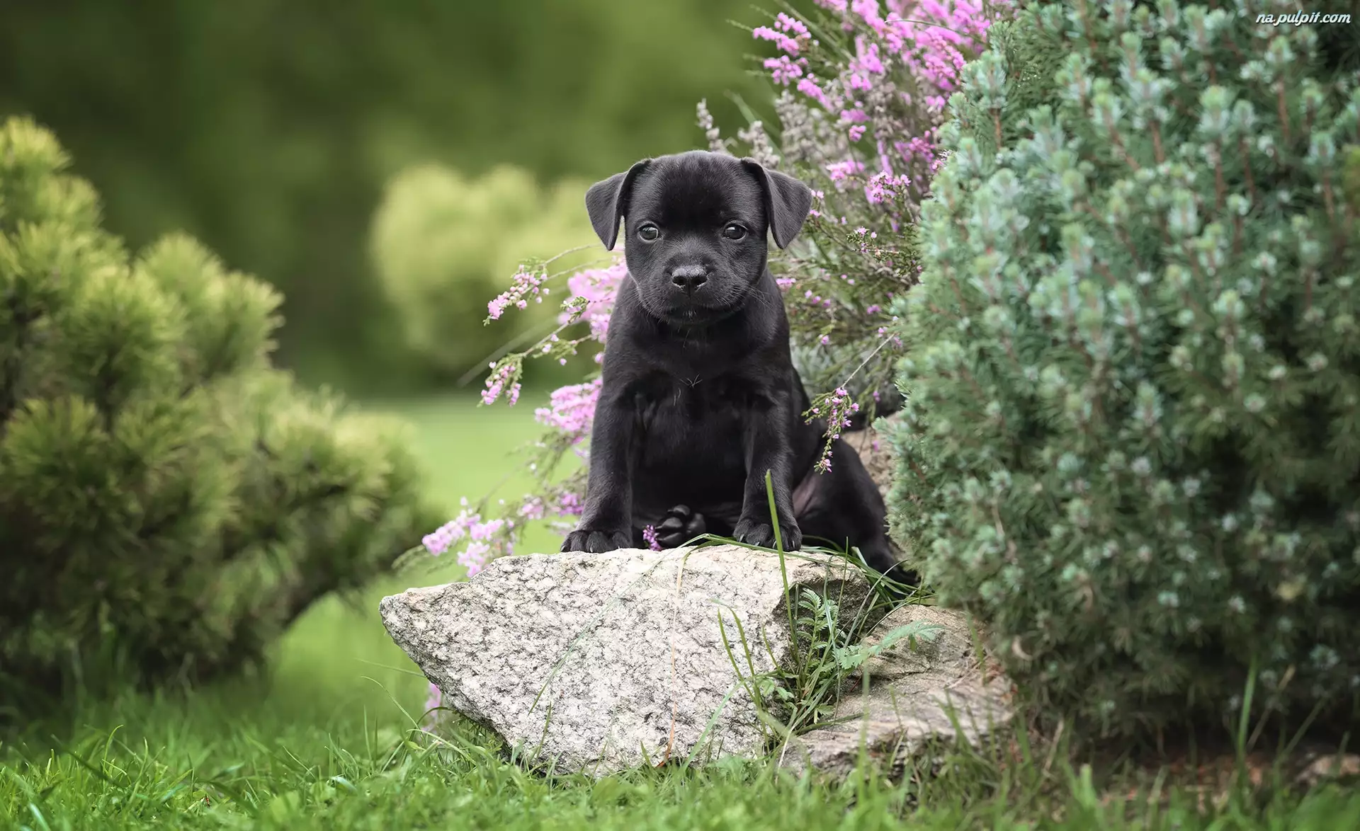 Szczeniak, Ogród, Pies, Czarny, Kamień