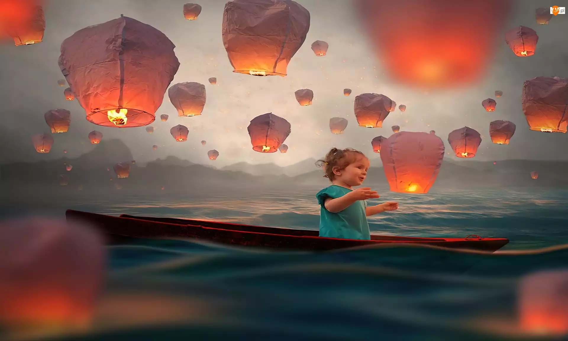 Szczęścia, Dziecko, Jezioro, Łódka, Balony