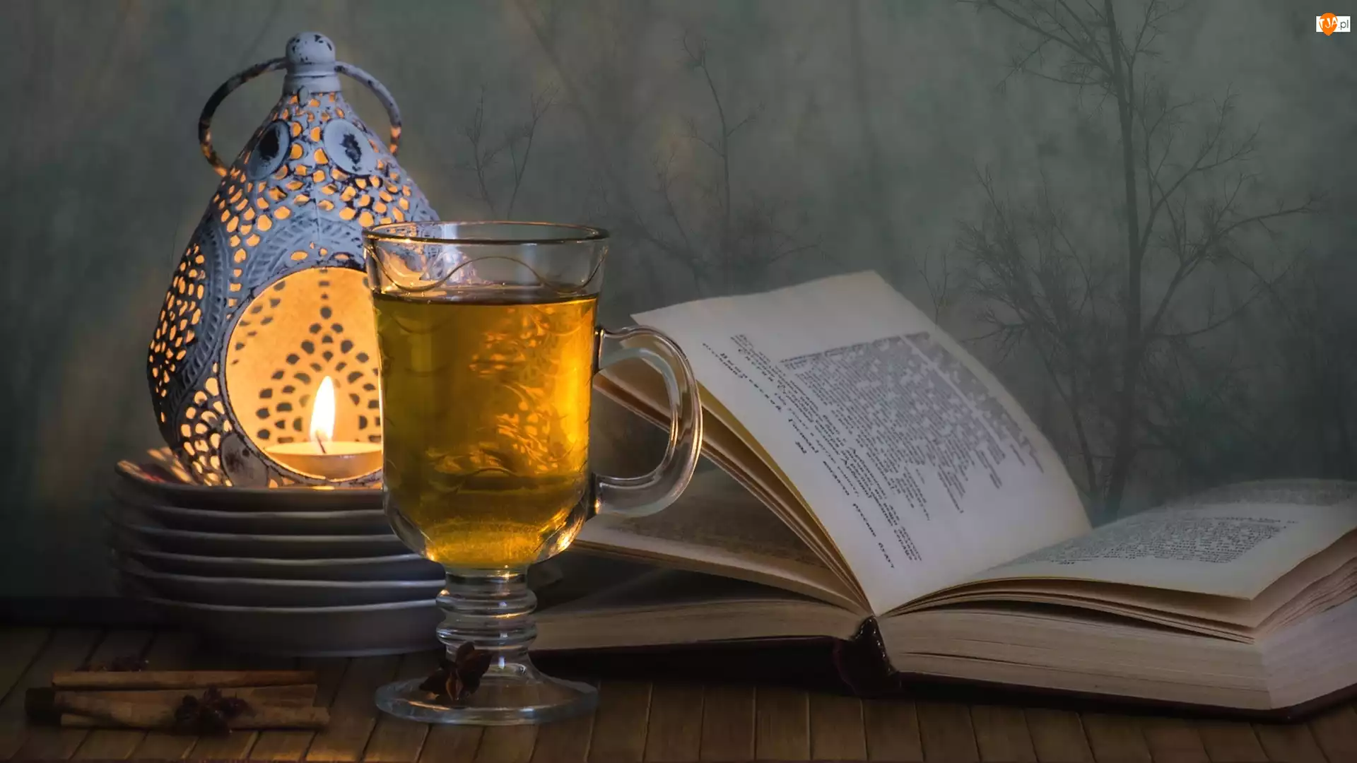 Lampion, Książka, Szklanka, Herbata
