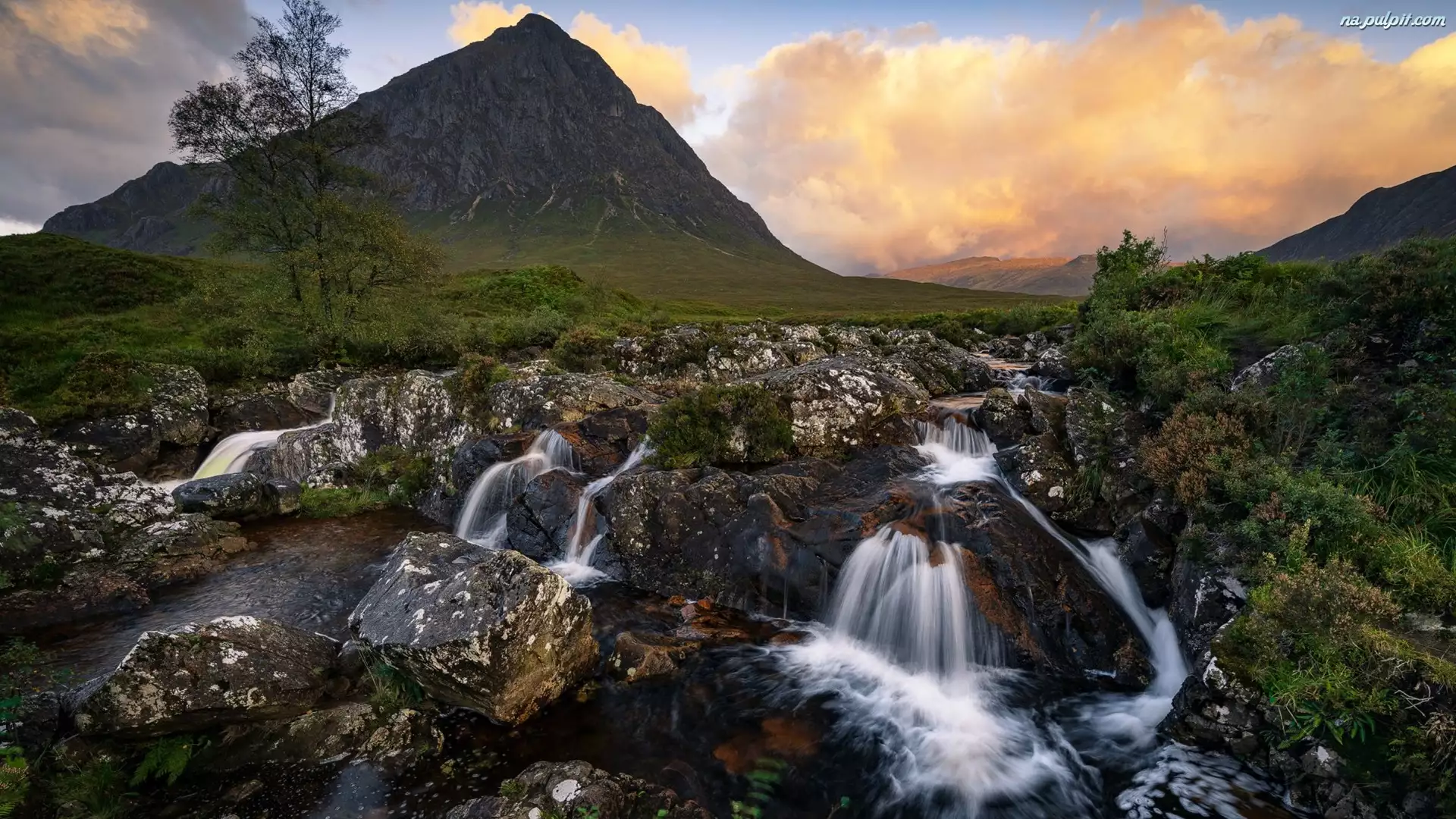 Szkocja, Szczyt Buachaille Etive Mor, Region Highland, Roślinność, Chmury, Rzeka, River Coupall, Góra, Kamienie