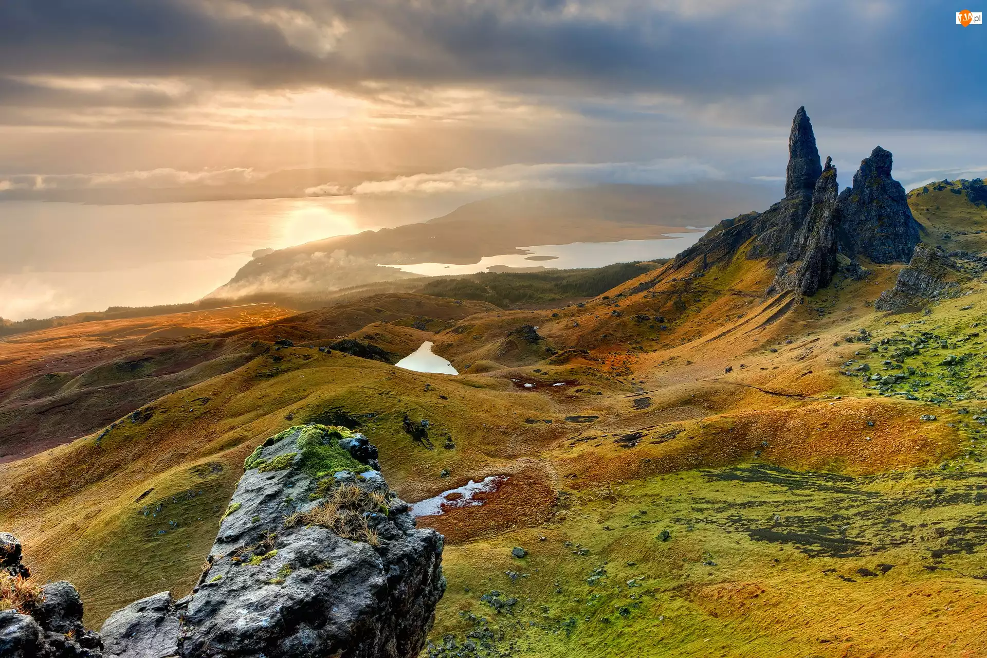 Skały, Szkocja, Doliny, Jezioro, Wyspa Skye, Wzgórze The Storr, Wschód słońca, Morze