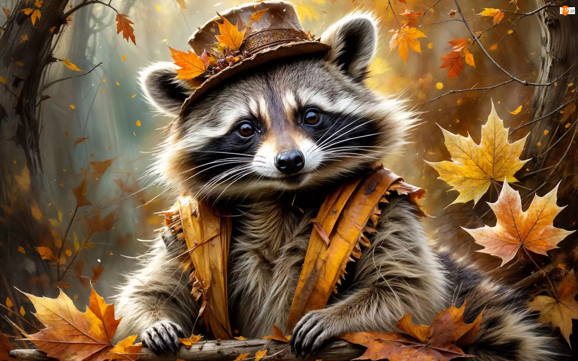 Szop pracz w kapeluszu z listkami jesiennymi w gra