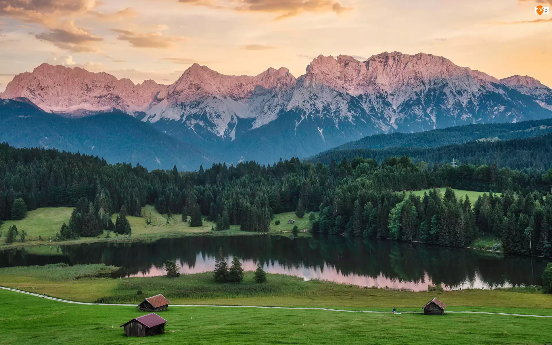 Domki, Drzewa, Alpy, Lasy, Trawa, Bawaria, Jezioro Geroldsee, Polana, Góry, Szopy, Niemcy