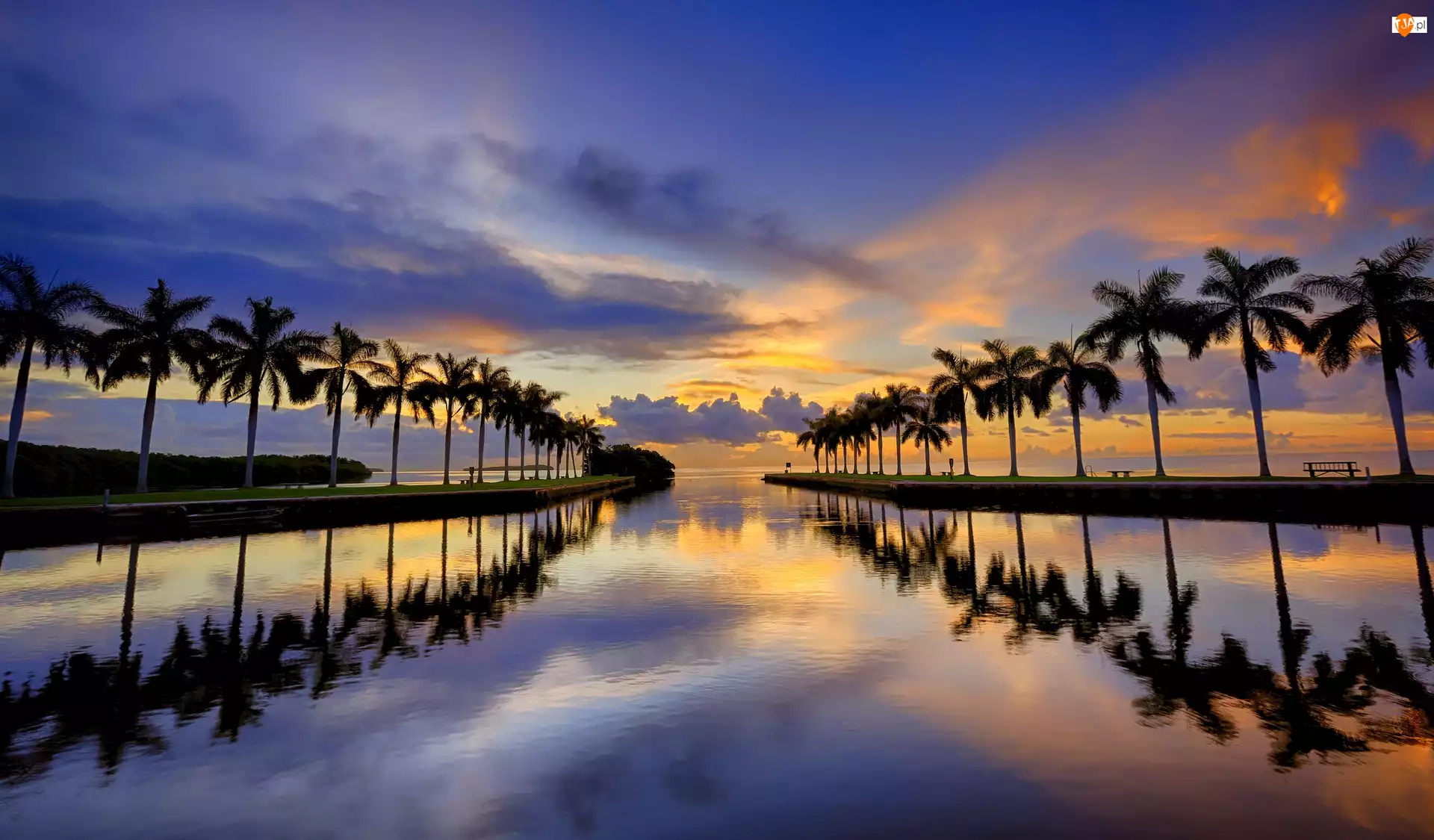 Szpalery, Morze, Ławki, Chmury, Palmy, Wschód słońca