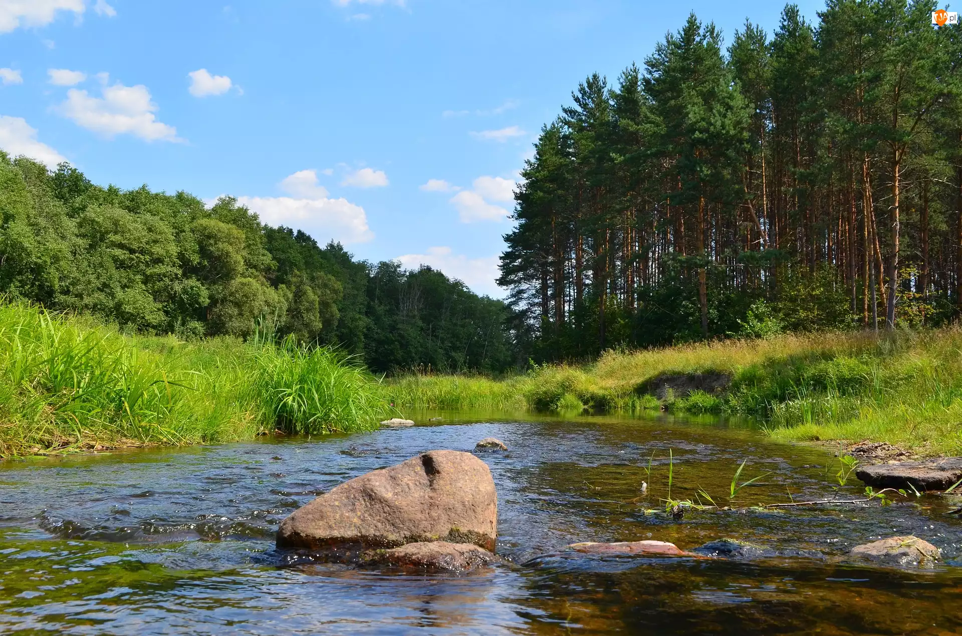 Zielona, Kamienie, Drzewa, Rzeka, Trawa