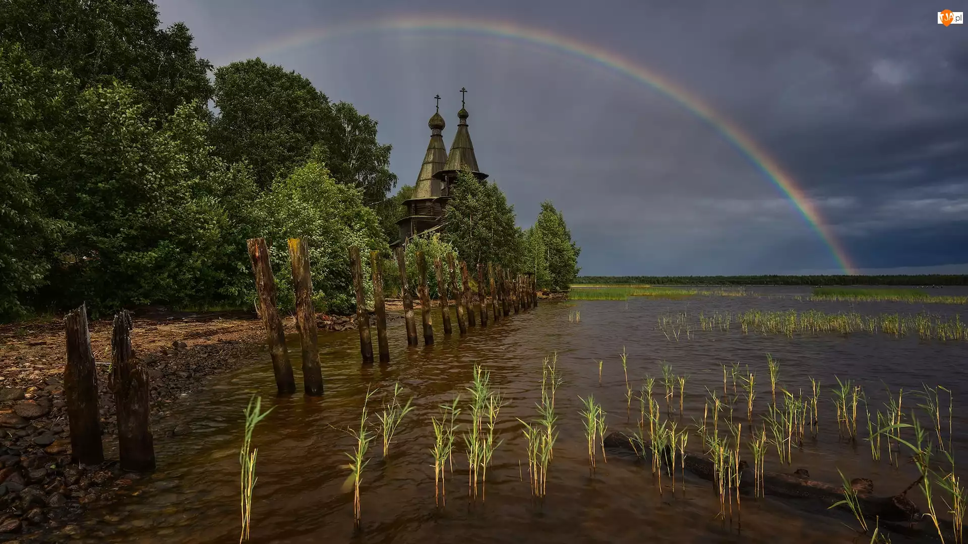 Szuwary, Jezioro, Cerkiew, Tęcza, Drzewa, Chmury