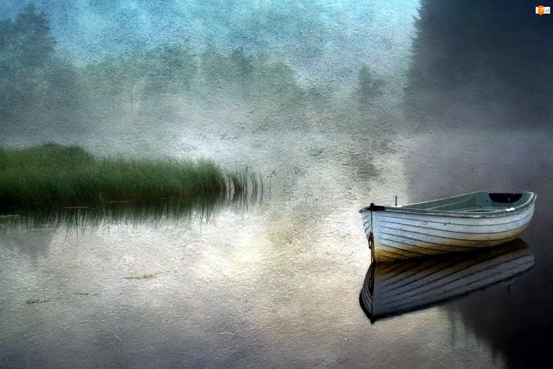 Szuwary, Malarstwo, Łódka, Obraz, Jezioro