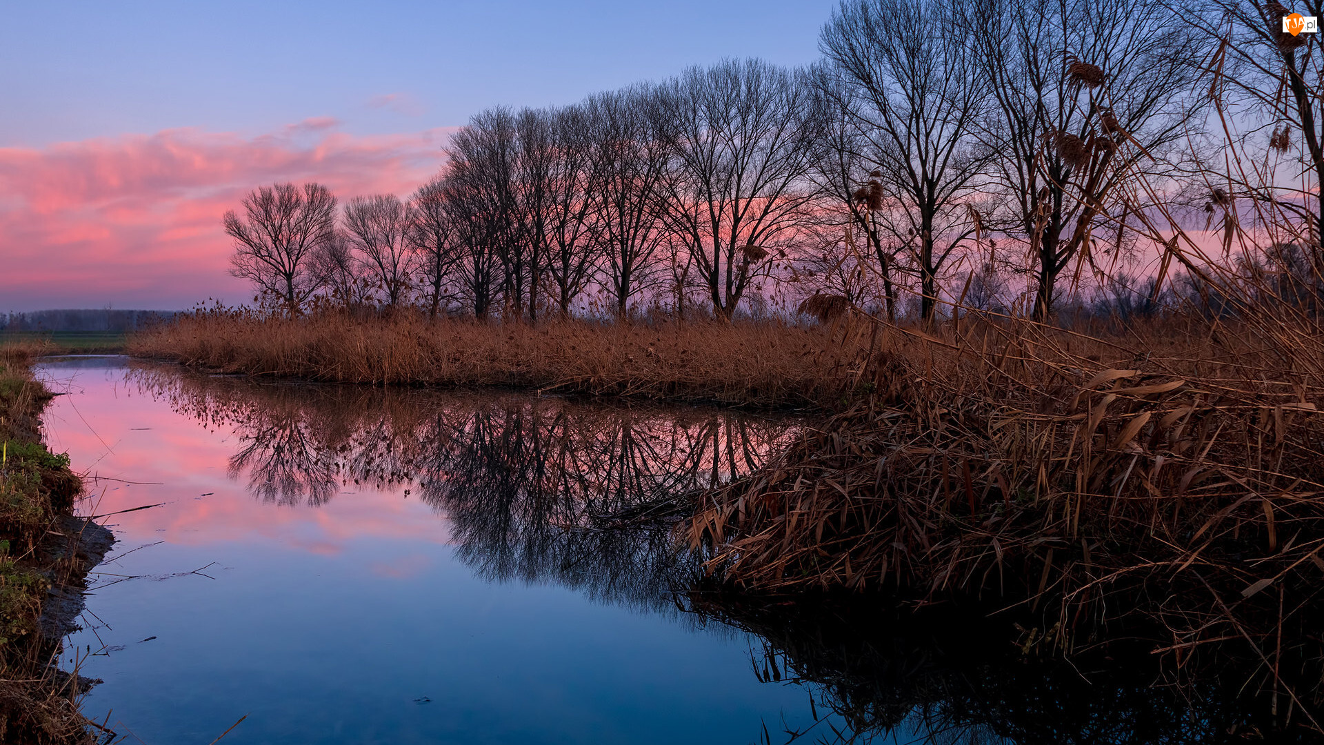 Szuwary, Odbicie, Jezioro, Wschód słońca, Drzewa