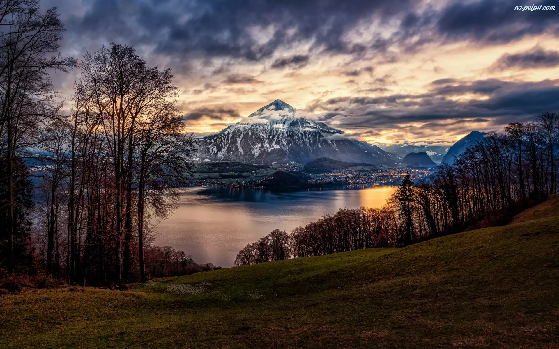 Szwajcaria, Drzewa, Chmury, Thunersee, Alpy Berne�
