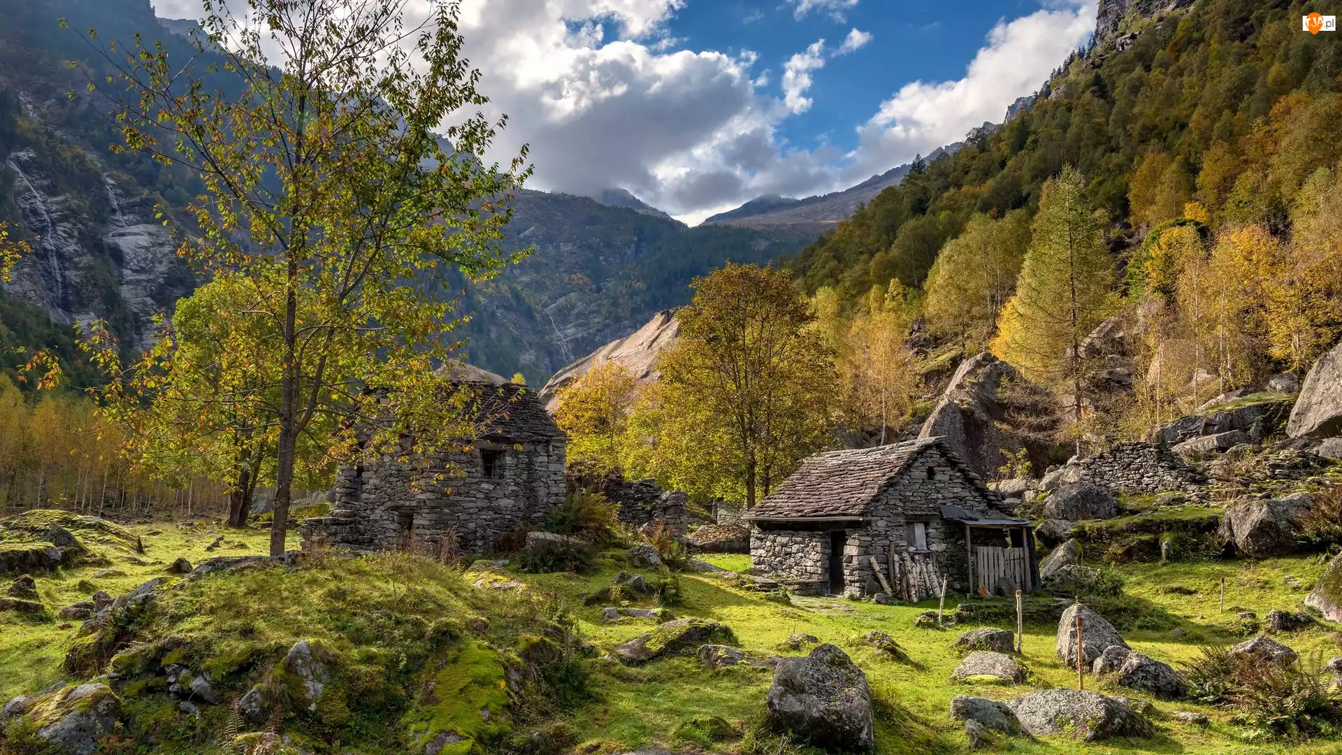 Szwajcaria, Drzewa, Kanton Tessyn, Dolina, Valle Maggia, Kamienne, Domy, Góry, Kamienie