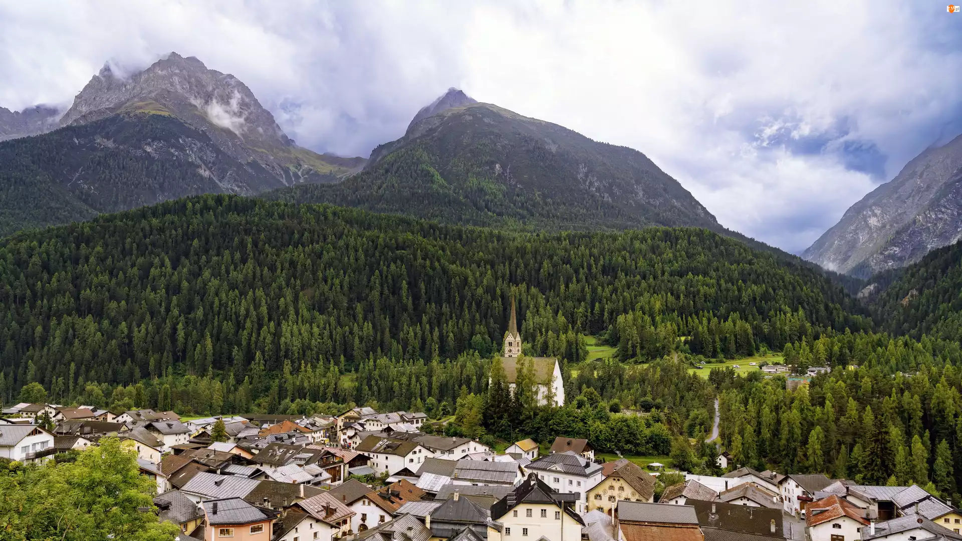 Szwajcaria, Kościół, Miasteczko, Alpy, Wzgórza, Drzewa, Las, Domy, Góry