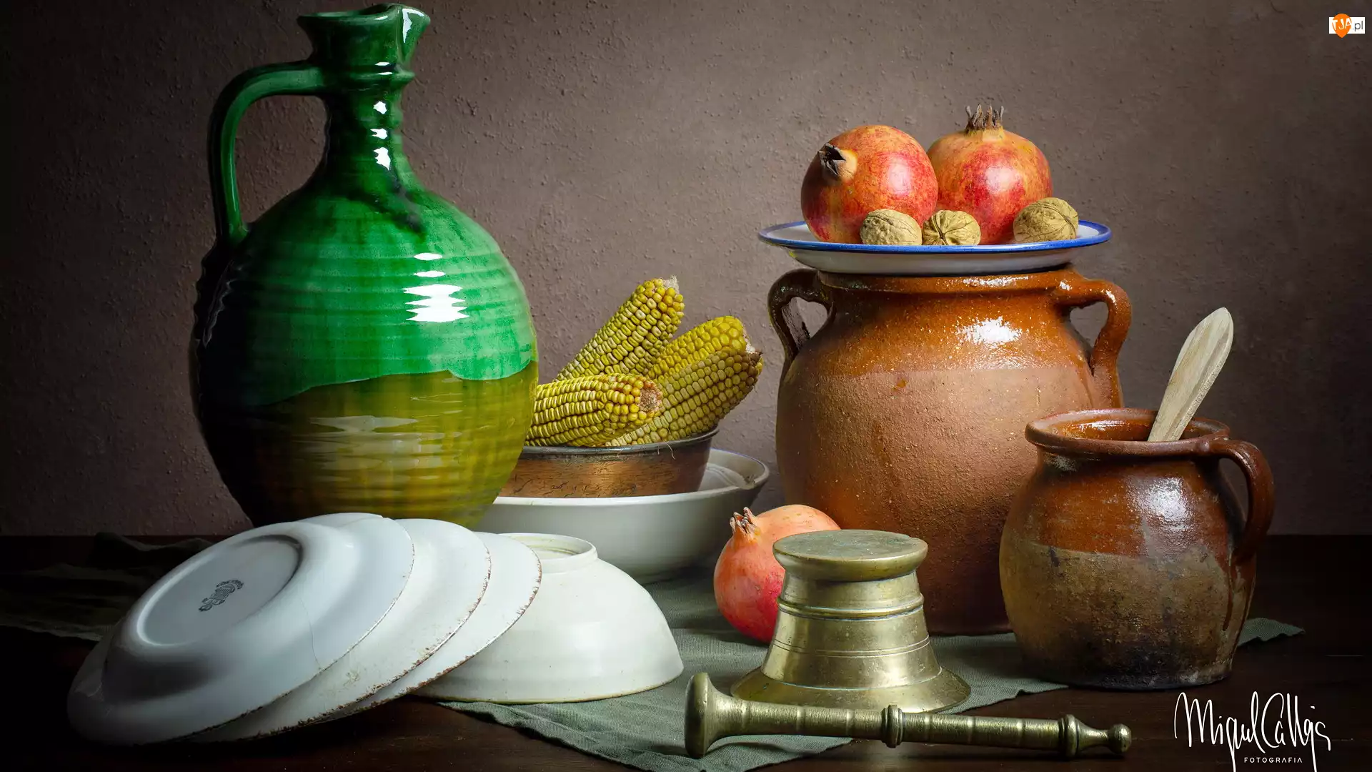 Talerze, Kompozycja, Kukurydza, Orzechy, Dzbanki, Granaty