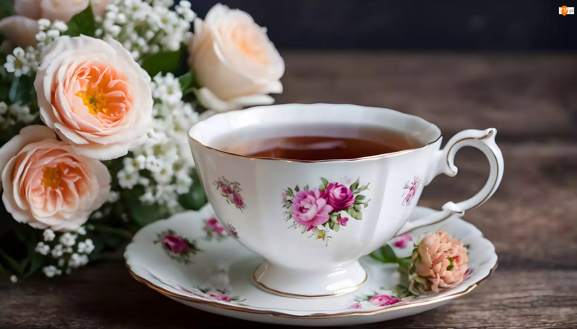 Talerzyk, Róże, Herbata, Filiżanka, Kwiaty