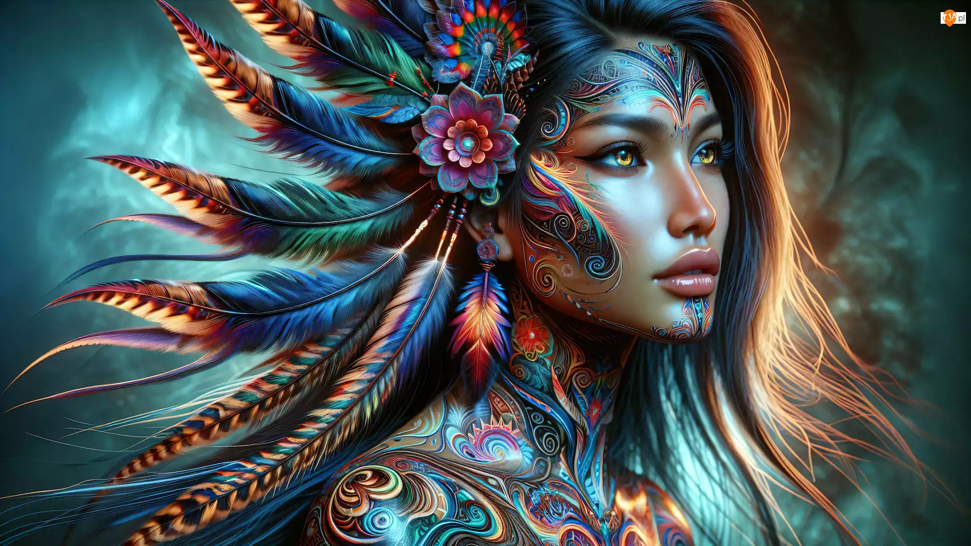 Tatuaż, Grafika, Makijaż, Kobieta, Pióropusz