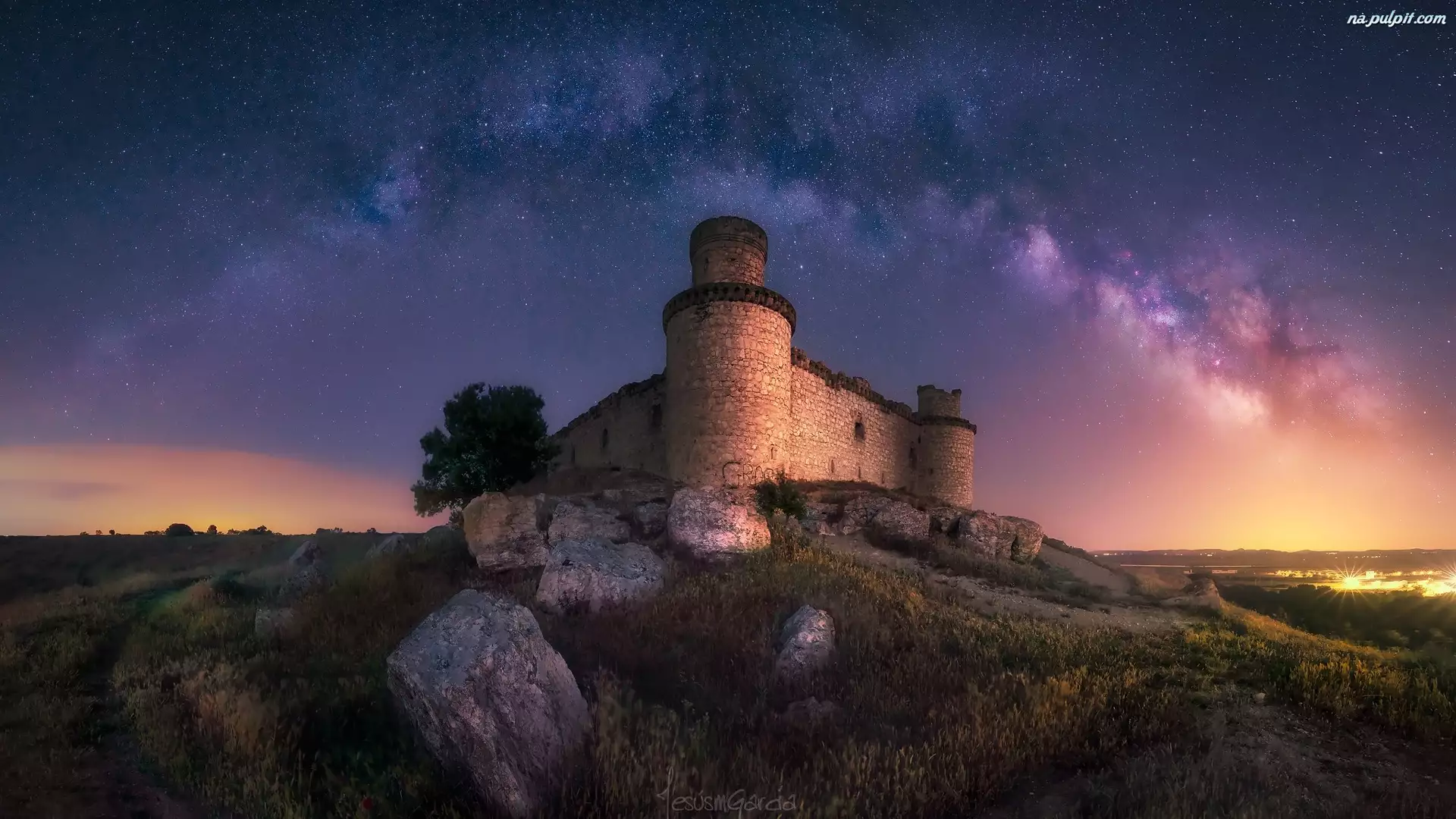 Toledo, Hiszpania, Noc, Droga Mleczna, Zamek Barcience, Gwiazdy