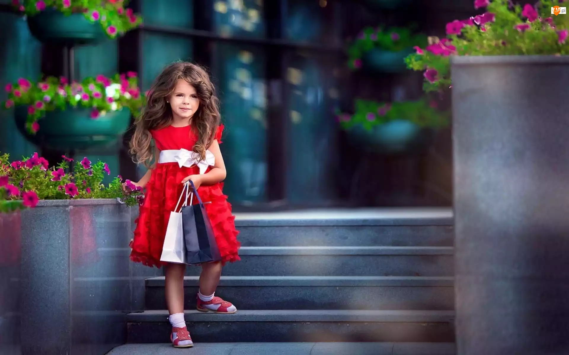 Torebki, Kwiaty, Sukienka, Dziewczynka, Schody