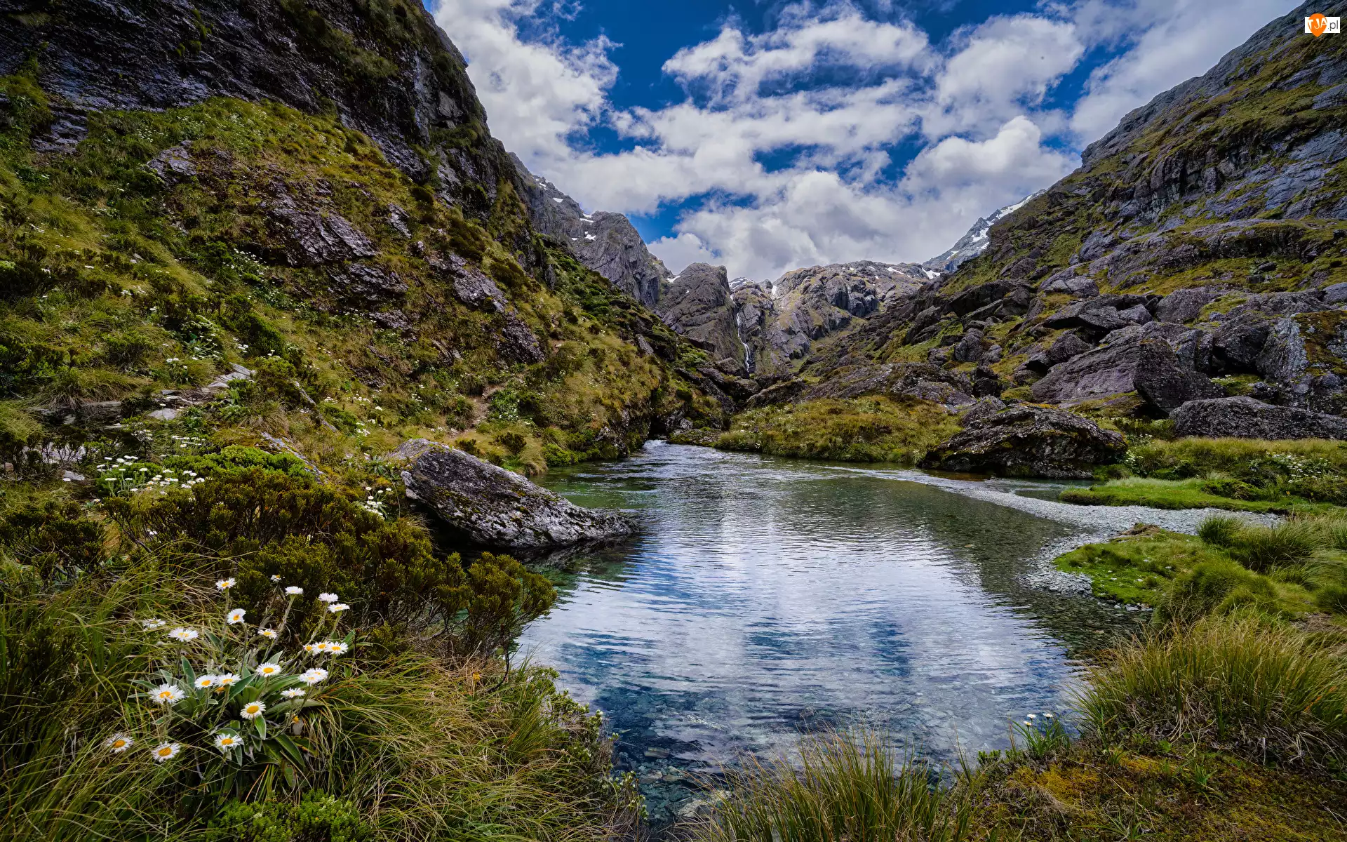 Trawa, Chmury, Jezioro, Góry, Kwiaty