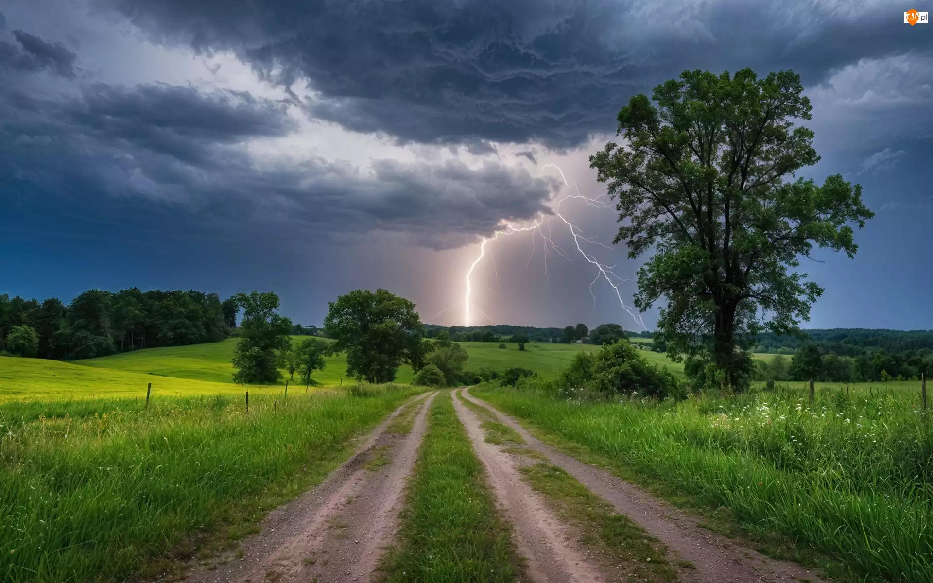 Trawa, Droga, Pola, Drzewa, Burza, Łąki, Grafika AI, Błyskawice