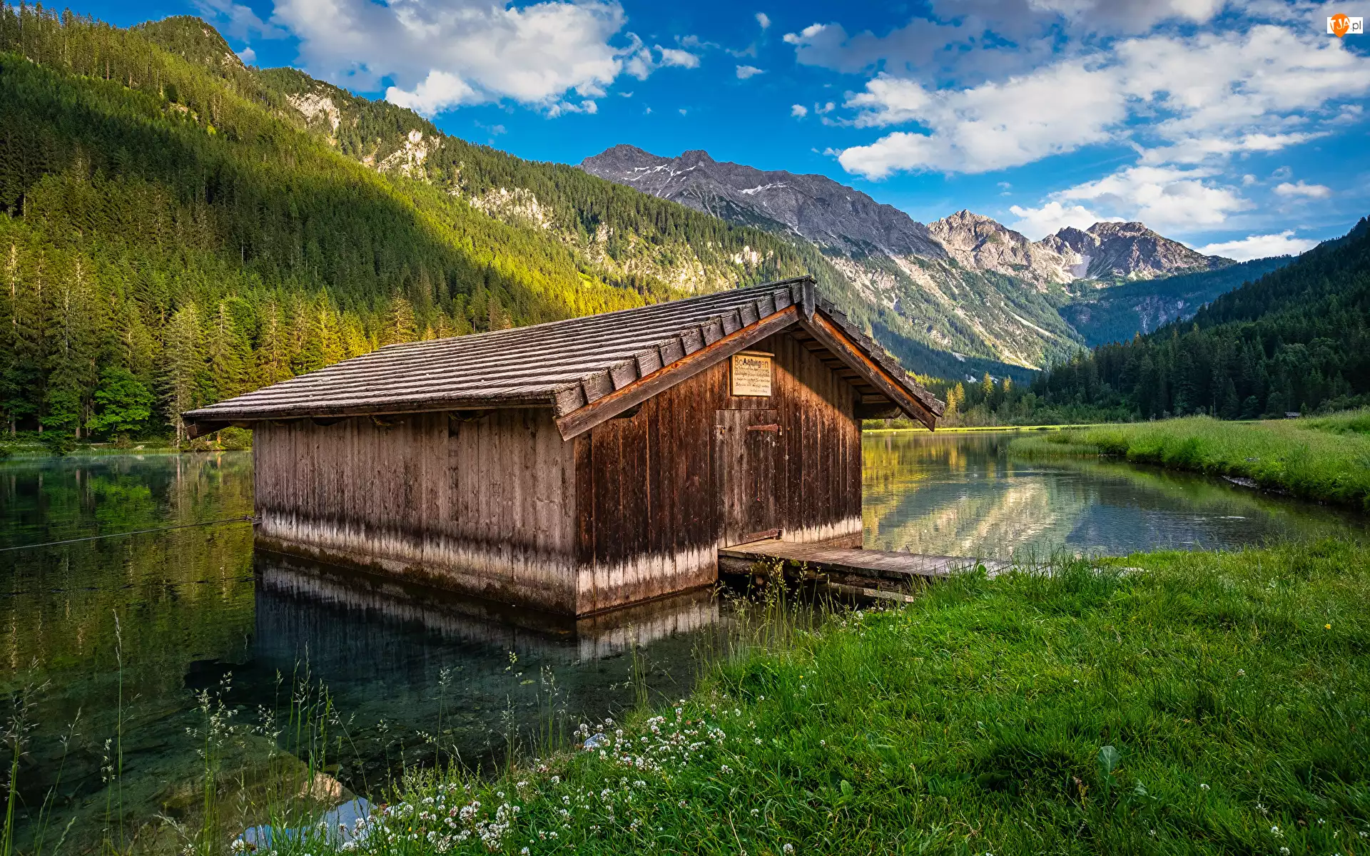 Trawa, Góry, Pomost, Domek, Szopa, Alpy, Las, Austria, Jezioro