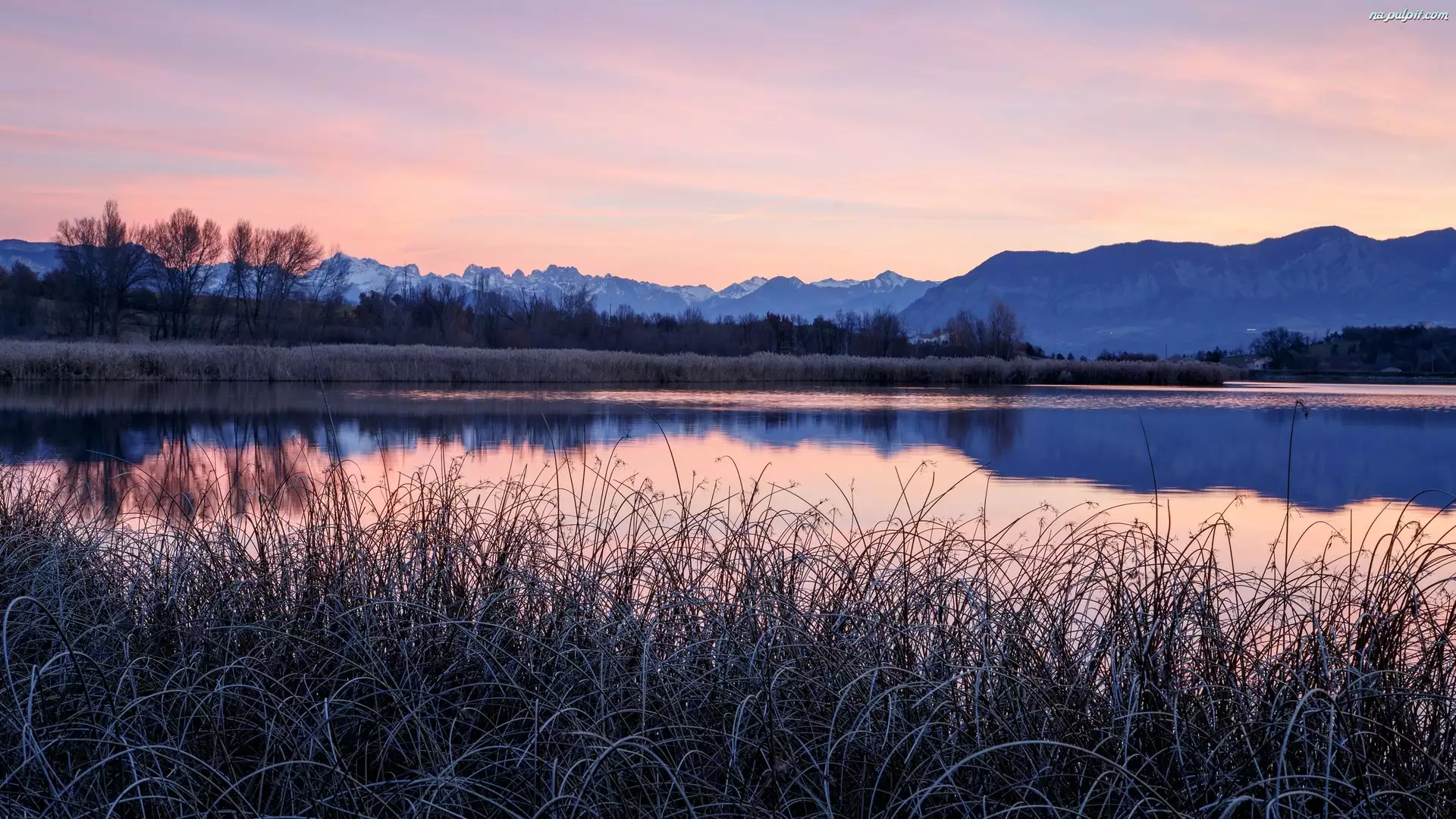 Trawa, Jezioro, Drzewa, Góry, Szuwary