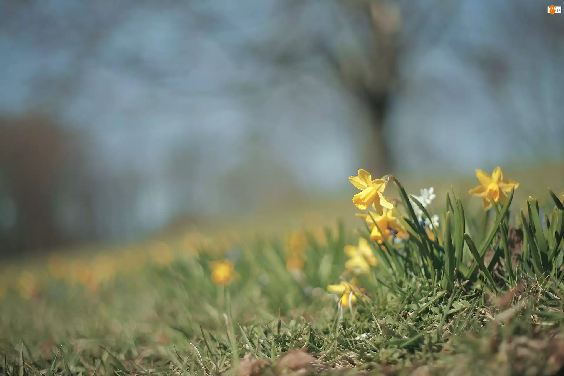 Trawa, Narcyzy żonkile, Żółte, Kwiaty