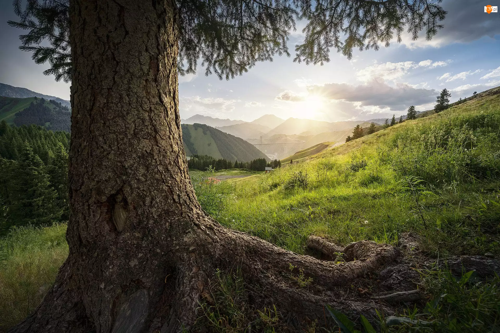 Trawa, Niebo, Polana, Wzgórza, Drzewo