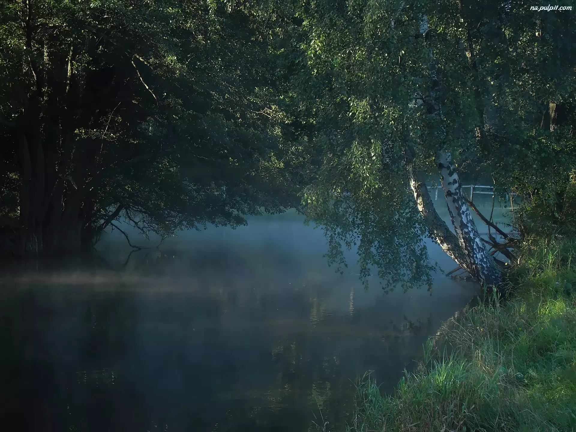 Trawa, Rzeka, Brzoza, Mgła, Liście
